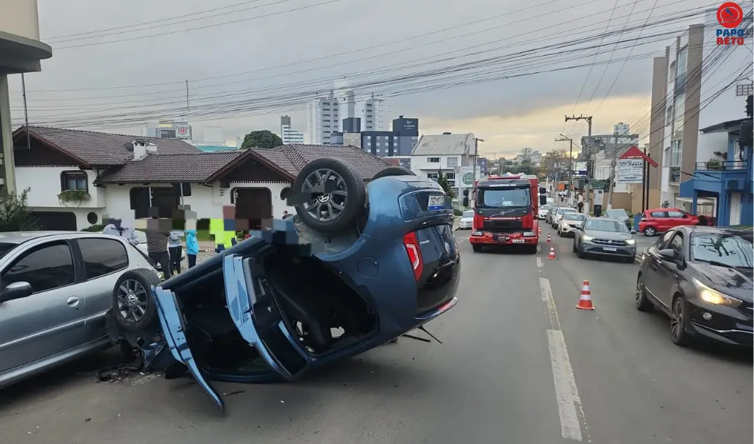 A ocorrência foi registrada na Rua Frei Rogério, no Centro da cidade, envolvendo um Volkswagen Up conduzido por uma mulher de 56 anos, que colidiu com um Peugeot 207 estacionado. Com o impacto, o Up acabou capotando na via.