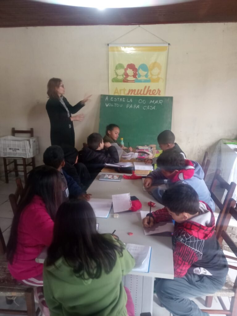 As atividades ocorrem com o apoio da comunidade local, como o grupo Art Mulher, da cozinha comunitária, que ajuda a receber as crianças com carinho.